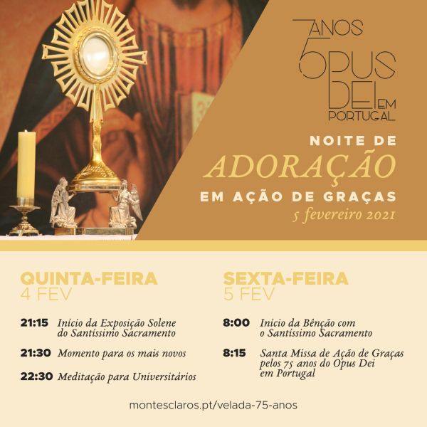 Respondendo ao recente apelo do Prelado aos portugueses, convidamos os que quiserem a juntar-se, de modo virtual, a esta noite de Adoração ao Santíssimo Sacramento em ação de graças pelos 75 anos do Opus Dei em Portugal, que decorrerá na capela da Residência Montes Claros em Lisboa.