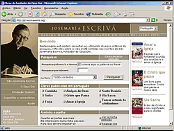 A tradução portuguesa dos livros publicados de Josemaría Escrivá já está na Internet. O endereço www.escrivaworks.org permite o acesso a ‘Caminho’ — com cerca de 4 500 000 de exemplares distribuídos em 43 idiomas — e a outros livros de espiritualidade cristã escritos por S. Josemaría: ‘Sulco’, ‘Forja’, ‘Cristo que passa’, ‘Amigos de Deus’, ‘Santo Rosário’, ‘Via Sacra’, ‘Amar a Igreja’ e ‘Temas actuais do cristianismo’.
