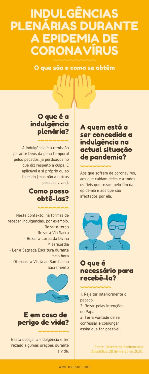 xplicamos abaixo com uma infografia como é possível obter a indulgência plenária, ou seja, a remissão perante Deus da pena temporal pelos pecados, durante a epidemia do coronavírus. Incluímos também o recente decreto da Penitenciária Apostólica da Santa Sé sobre este tema.