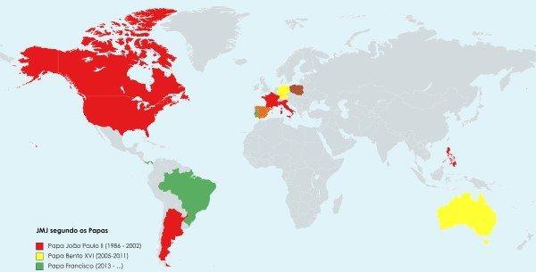 - Jornadas Mundias da Juventude convocadas pelo Papa João Paulo II (países a vermelho no mapa):