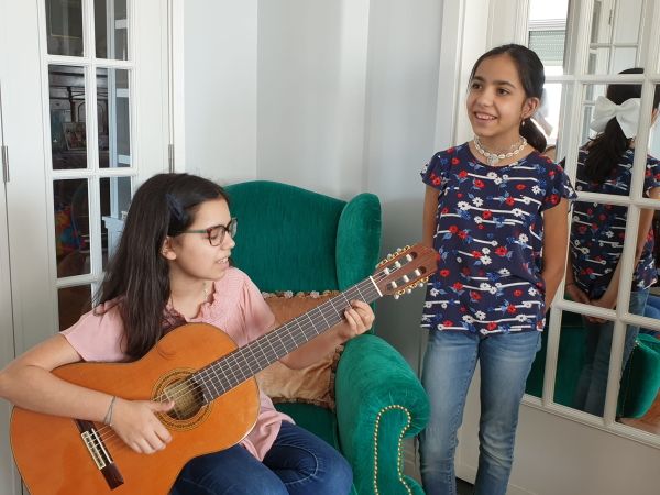 ► Maria: A Beatriz ouviu várias vezes a música e descobriu quais eram os acordes. É uma canção muito simples e, por isso, foi fácil. Depois, começámos a cantar e inventámos uma segunda voz. Foi muito giro! Agora, ao pensar nisso, lembro-me de que estávamos no início da pandemia, ninguém saía de casa e havia tanto medo no ar… E nós a cantarolar estas canções! 😊