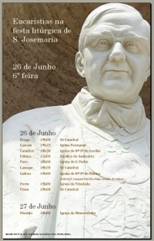 Por ocasião da festa de S. Josemaria (próxima sexta-feira, dia 26 de Junho), vão ser celebradas em todo o mundo missas em honra deste santo. Apresentamos abaixo algumas das missas que serão celebradas em Portugal.