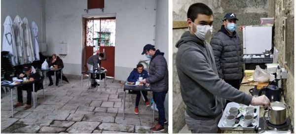 O trabalho resume-se a chegar cedo para preparar a refeição - aquecer o leite ou água, preparar os pães, montar as mesas, etc. -, e distribuir o pequeno-almoço. Pouco antes das 8h abrem as portas e começam a servir os indigentes. O local não podia ser mais simpático: uma casa do sec. XVIII, mesmo no centro da cidade antiga.