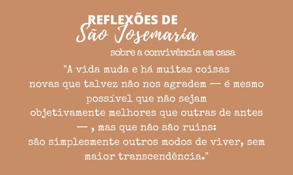 Por outro lado, os pais têm também que procurar manter o coração jovem, para lhes ser mais fácil acolher com simpatia as aspirações nobres e inclusive as extravagâncias dos filhos. A vida muda e há muitas coisas novas que talvez não nos agradem — é mesmo possível que não sejam objetivamente melhores que outras de antes —, mas que não são más: são simplesmente outros modos de viver. Em não poucas ocasiões os conflitos aparecem porque se dá importância a ninharias que se superam com compreensão e senso de humor”.