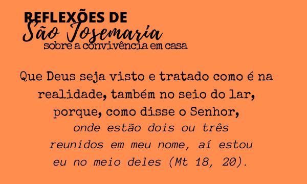 Dessa maneira conseguiremos que Deus não seja considerado um estranho, a quem se vai ver uma vez por semana na Igreja, ao domingo. Que Deus seja visto e tratado como é na realidade, também no seio da família, porque, como disse o Senhor, onde estiverem reunidos em meu nome, dois ou três, eu estou no meio deles (Mt 18, 20).