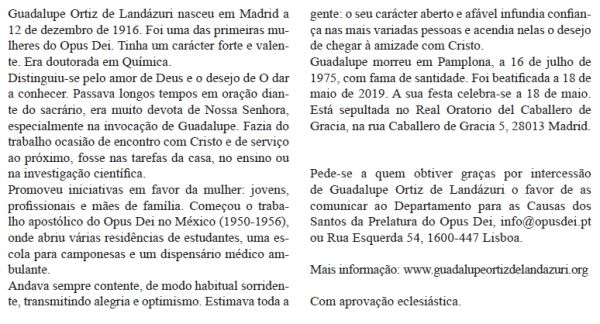 Deus Pai, concedei-me por intercessão da Bem-aventurada Guadalupe que saiba, como ela, realizar com amor o trabalho do dia-a-dia e contagiar a minha fé e a minha alegria a todos os que me rodeiam, para que muitos mais Vos conheçam e amem.