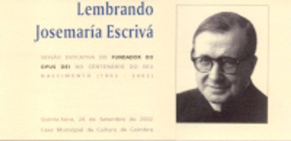 “Lembrando Josemaría Escrivá” é o tema de uma sessão evocativa do fundador do Opus Dei, no centenário do seu nascimento (1902-2002) que se realizará no próximo dia 26 de Setembro, pelas 21h15, na Casa Municipal da Cultura, em Coimbra.