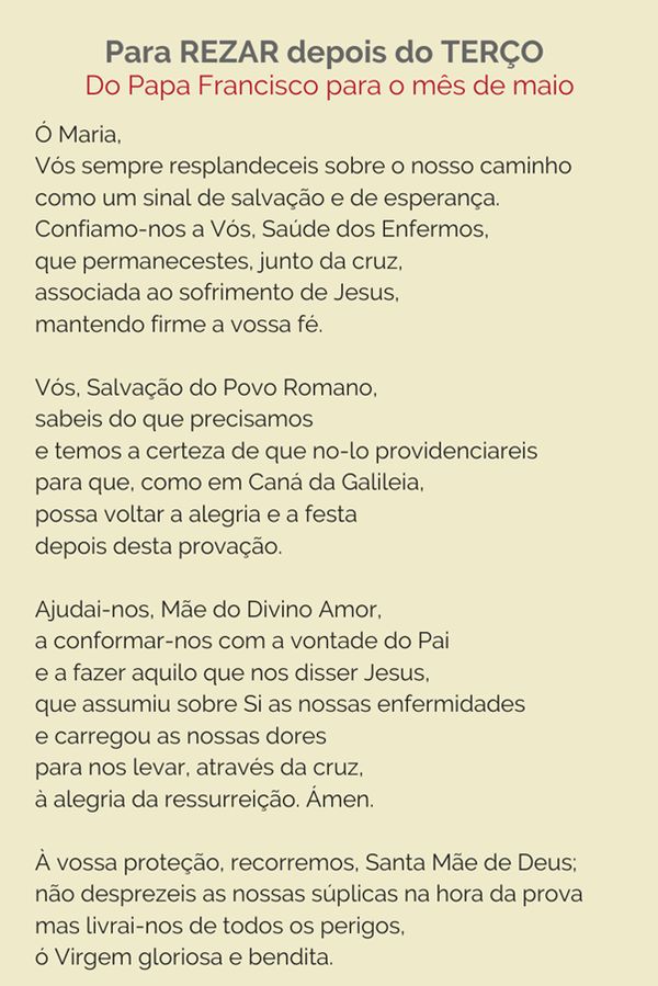 ● Carta do Papa Francisco a todos os fiéis para o mês de maio , na qual oferece duas oração a Nossa Senhora que podem ser recitadas no final do terço.