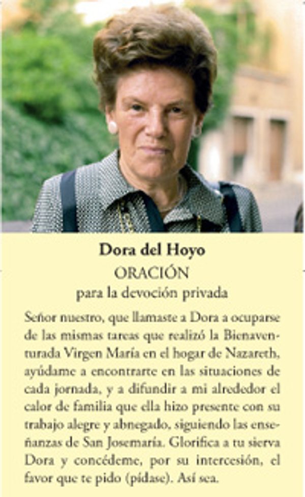 „Doamne, Dumnezeule nostru, care ai chemat-o pe Dora să se ocupe de aceleași activități pe care le-a realizat Preasfânta Fecioară Maria în căminul din Nazareth, ajută-mă să te găsesc în împrejurările vieții de zi cu zi, și să se răspândească în jurul meu căldura familiei pe care ea a realizat-o prin munca sa veselă și sacrificată, urmărind învățăturile Sf. Josemaría”. Așa zice rugăciunea pentru devoțiunea Dorei, cum o numea familiar Fondatorul Opus Dei pe Salvadora del Hoyo.
