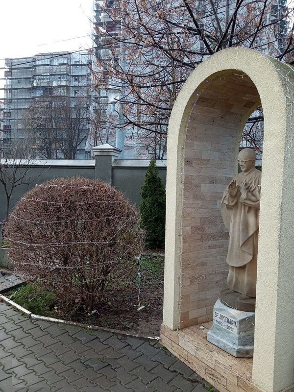 Statuia este din piatră, operă a sculptorului Etsuro Sotoo, un artist japonez care lucrează la Bazilica Sagrada Familia din Barcelona. Această imagine de cult a fost binecuvântată de către Arhiepiscopul din București, IPS Ioan Robu, în cadrul unei Sf. Liturghie, miercuri, 26 iunie 2013, comemorarea liturgică a întemeietorului Opus Dei.