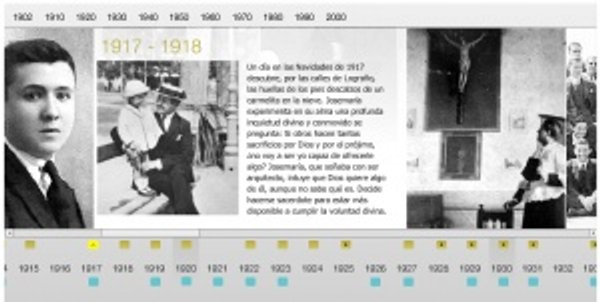 Timeline-ul interactiv narează viața Sfântului Josemaría și istoria Opus Dei, prin poze, materiale video și texte scurte, pe o linie de timp interactivă, paralelă cu evenimentele istorice mai importante ale epocii.