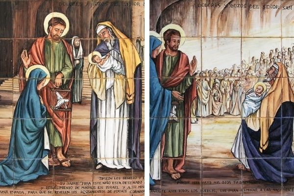 Štvrtá bolesť: Simeon ich požehnal a Márii, jeho matke, povedal: „On je ustanovený na pád a na povstanie pre mnohých v Izraeli a na znamenie, aby vyšlo najavo zmýšľanie mnohých sŕdc. (Lk 2,34-35)