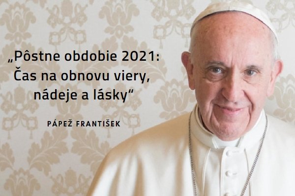 Prežívať Pôstne obdobie v láske značí starať sa o tých, čo v dôsledku pandémie Covidu-19 trpia, sú opustení alebo ustráchaní. V situácii veľkej neistoty ohľadom zajtrajška si spomeňme na slová, ktorými sa Boh obracia na svojho Služobníka: „Neboj sa, veď ťa vykúpim, po mene ťa zavolám ty si môj“ (Iz 43, 1) a v láske ponúknime aj slová nádeje, ktoré umožnia druhému pocítiť, že Boh ho miluje ako svoje dieťa.
