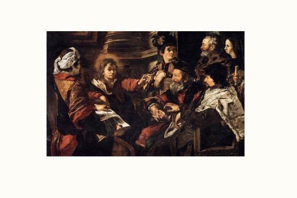 Tak ubehol druhý deň v starostiach a bolestiach. Znova sa vrátili a prešli miesta, ktoré predtým navštívili, až ho našli tretí deň v chráme, pravdepodobne v jednej sále vedľa nádvoria, ktoré učitelia Zákona používali na prednášanie. Bola to jedna z častých scén v sviatočné dni: učiteľ na vyvýšenej stoličke, aby ho bolo dobre vidieť a počuť, v rukách mal posvätný zväzok knihy. Vysvetľoval poslucháčom, sediacim na podlahe nejakú pasáž z Písma. Občas položil učiteľ otázku, na ktorú odpovedali najpokročilejší žiaci. Tak našli Jozef a Mária Ježiša, ako sedí uprostred učiteľov, počúva a dáva im otázky. Všetci, ktorí ho počúvali, žasli nad jeho chápavosťou a jeho odpoveďami (Lk 2,46-47).
