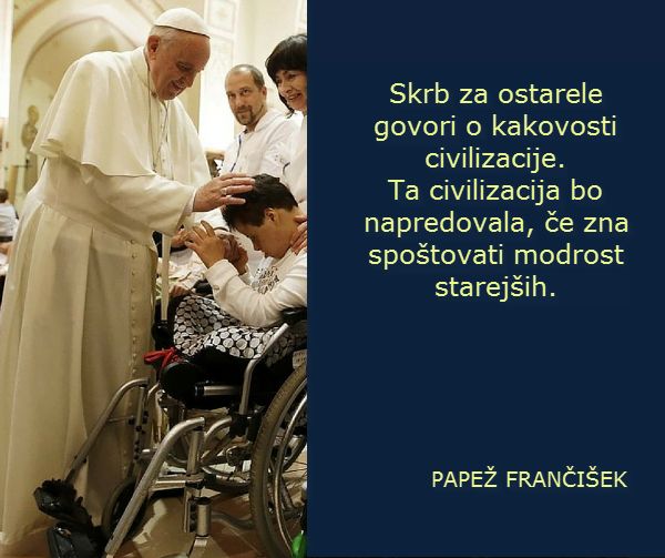 30. Skrb za ostarele govori o kakovosti civilizacije. Ta civilizacija bo napredovala, če zna spoštovati modrost starejših. V civilizaciji, kjer ni prostora za ostarele oz. se jih odstranjuje, ker povzročajo probleme, takšna civilizacija nosi s seboj virus smrti. (4. marec 2015)