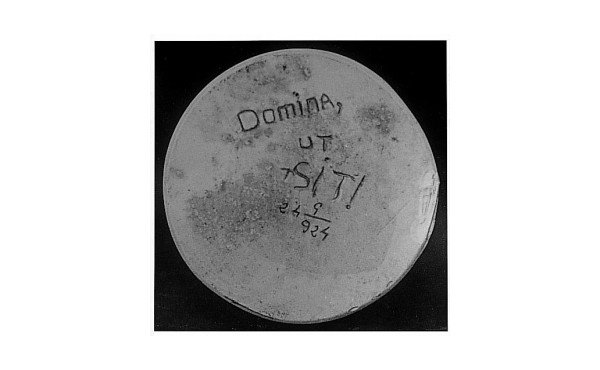 Pokazala sem mu podstavek kipa, na katerem je bilo mogoče prebrati z žebljem zapisan molitveni vzklik: Domina, ut sit!, zraven pa datum: 24-5-924.Latinske besede so bile sklenjene s klicajem, tako kot je naš oče ponavadi zapisoval molitvene vzklike v latinščini.