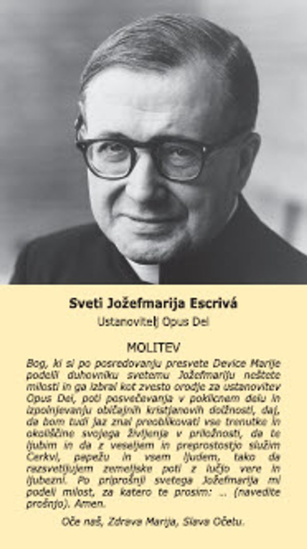 Bog, ki si po posredovanju presvete Device Marije podelil duhovniku svetemu Jožefmariju neštete milosti in ga izbral kot zvesto orodje za ustanovitev Opus Dei, poti posvečevanja v poklicnem delu in izpolnjevanju običajnih kristjanovih dolžnosti, daj, da bom tudi jaz znal preoblikovati vse trenutke in okoliščine svojega življenja v priložnosti, da te ljubim in da z veseljem in preprostostjo služim Cerkvi, papežu in vsem ljudem, tako da razsvetljujem zemeljske poti z lučjo vere in ljubezni. Po priprošnji svetega Jožefmarija mi podeli milost, za katero te prosim: … (navedite prošnjo). Amen.