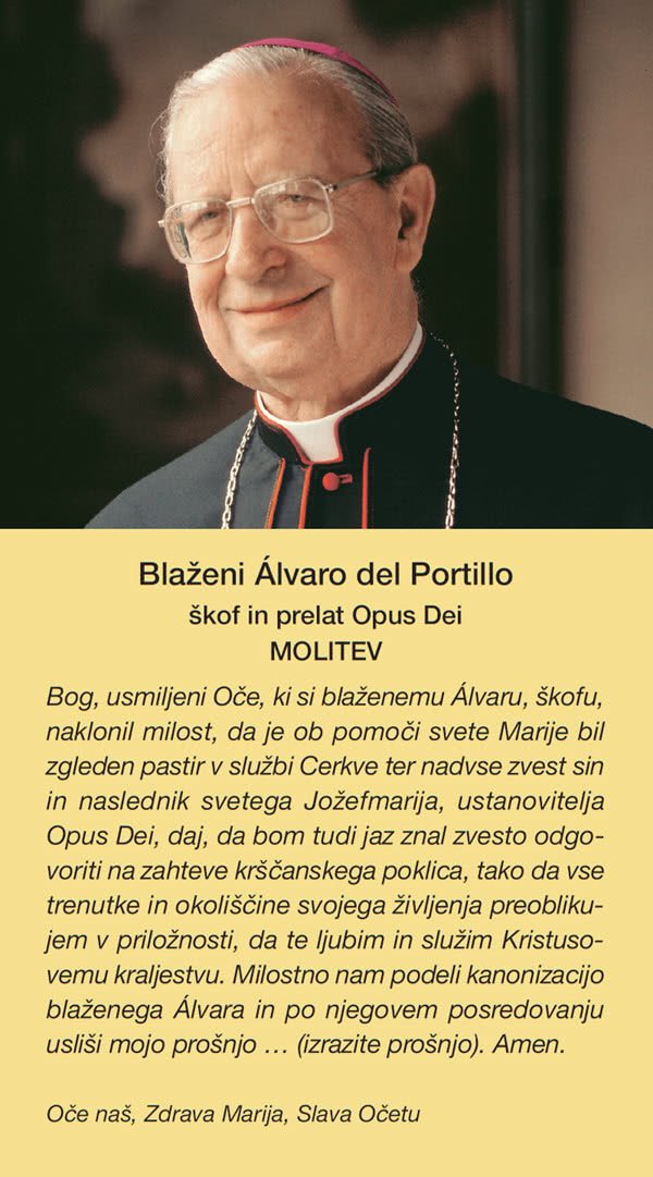 Bog, usmiljeni Oče, ki si blaženemu Álvaru, škofu, naklonil milost, da je ob pomoči svete Marije bil zgleden pastir v službi Cerkve ter nadvse zvest sin in naslednik svetega Jožefmarija, ustanovitelja Opus Dei, daj, da bom tudi jaz znal zvesto odgovoriti na zahteve krščanskega poklica, tako da vse trenutke in okoliščine svojega življenja preoblikujem v priložnosti, da te ljubim in služim Kristusovemu kraljestvu. Milostno nam podeli kanonizacijo blaženega Álvara in po njegovem posredovanju usliši mojo prošnjo … (izrazite prošnjo). Amen.