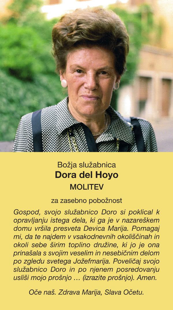 Gospod, svojo služabnico Doro si poklical k opravljanju istega dela, ki ga je v nazareškem domu vršila presveta Devica Marija. Pomagaj mi, da te najdem v vsakodnevnih okoliščinah in okoli sebe širim toplino družine, ki jo je ona prinašala s svojim veselim in nesebičnim delom po zgledu svetega Jožefmarija. Poveličaj svojo služabnico Doro in po njenem posredovanju usliši mojo prošnjo … (izrazite prošnjo). Amen.