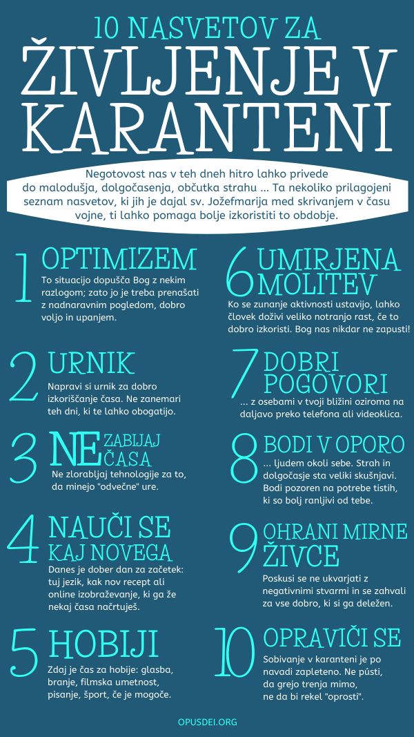 Toda ta čas navidezne nedejavnosti je tudi priložnost za to, da svoje državljanske doložnosti vršimo odgovorno, da izkoristimo čas in se s solidarno molitvijo povežemo s tistimi, ki jim je težje kot nam, pa tudi z zdravstvenim osebjem ter drugimi ljudmi in ustanovami, ki s svojo prizadevnostjo in predanostjo delajo za izboljšanje stanja.