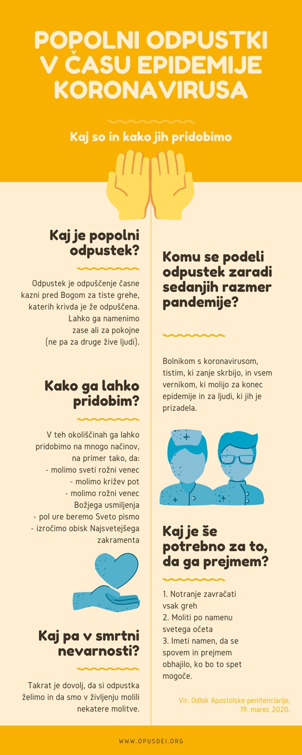 Preprosta infografika prikazuje, kako je v času epidemije koronavirusa mogoče pridobiti popolni odpustek, se pravi odstranitev časne kazni za grehe.