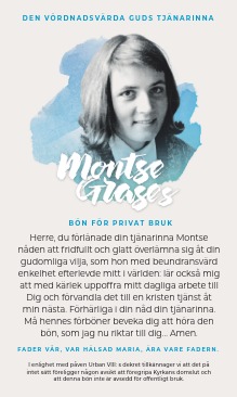 Herre, du förlänade din tjänarinna Montse nåden att fridfullt och glatt överlämna sig åt din gudomliga vilja, som hon med beundransvärd enkelhet efterlevde mitt i världen: lär också mig att med kärlek uppoffra mitt dagliga arbete till Dig och förvandla det till en kristen tjänst åt min nästa. Förhärliga i din nåd din tjänarinna. Må hennes förböner beveka dig att höra den bön, som jag nu riktar till dig… Amen.