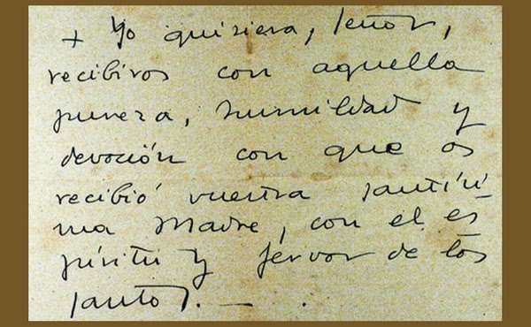 Jag visste att det var genom en av hans lärare, pater Manuel Laborda, som grundaren till Opus Dei fick lära sig den andliga kommunionen som har stärkt den eukaristiska fromheten hos många människor världen över. Pater Laborda var lärare på den skola i Barbastro där den helige Josemaría gick som pojke. Men vad var själva ursprunget till denna pärla av eukaristisk fromhet? Var det en bön som alla piaristbröder i skolan i Barbastro bad eller var det bara Fader Laborda som bad den? Trots att jag inte letade efter källan till denna bön, hittade jag den av en slump, och det var verkligen tur.