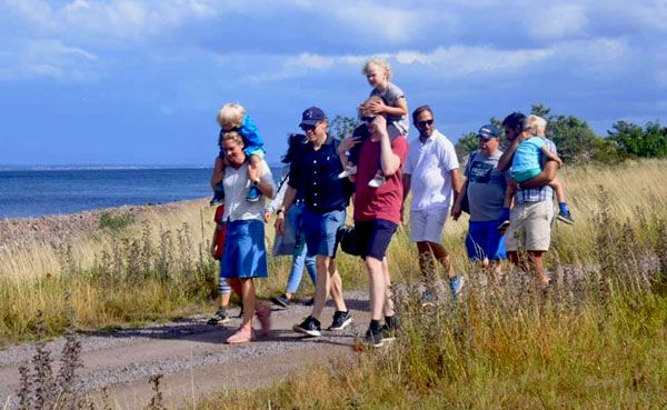 Efter lunchen ger vi oss iväg på vandring. De små barnen somnar hängande på ryggen eller i en vuxens famn. Lagom till fika och bad piggnar de till. Och när de sedan blir grillkväll vill de aldrig gå och lägga sig. De vuxna vill sitta uppe och prata och ser mellan fingrarna. Både vuxna och barn kommer i säng alldeles för sent.