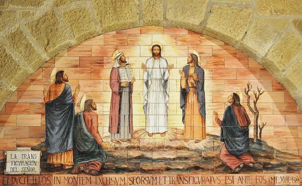 Sex dagar senare tog Jesus med sig Petrus, Jakob och hans bror Johannes och gick med dem upp på ett högt berg, där de var ensamma. Där förvandlades han inför dem: hans ansikte lyste som solen, och hans kläder blev vita som ljuset. Och de såg Mose och Elia stå och samtala med honom. Då sade Petrus till Jesus: