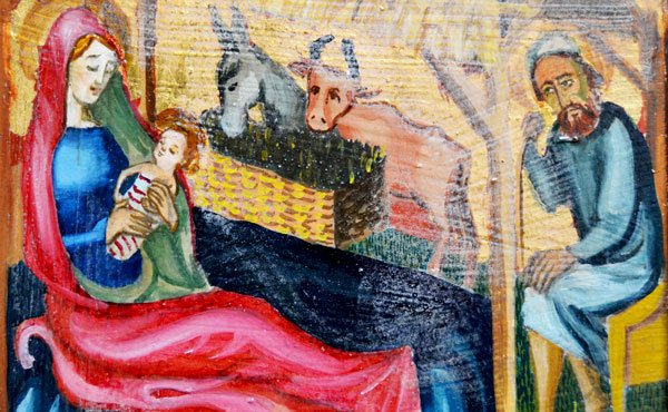 Och i Betlehem föds vår Gud, Jesus Kristus! – I ett stall: det finns inte plats i härbärget. – Hans moder lindar honom och lägger honom i en krubba (Luk 2:7).