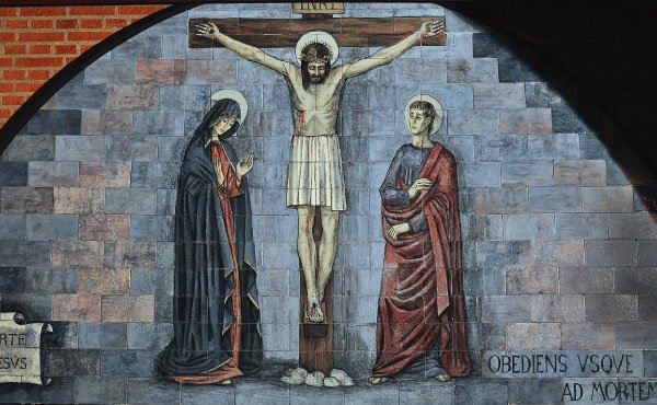 Nu är han upphöjd … – Bredvid sin son, vid korsets fot, står den heliga Maria … och Maria, Klopas hustru, och Maria från Magdala. Och Johannes, lärjungen som han älskade. Ecce mater tua! – Där är din moder! Han ger oss sin moder till att vara vår moder.