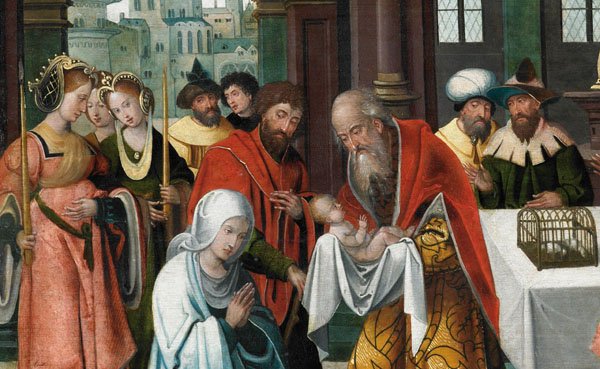 I Betlehem har pilgrimerna skingrats. Efter Jesu födelse fann Josef en lämpligare plats för att hysa den Heliga Familjen. Åtta dagar senare fullgjordes föreskriften för omskärelsen, genom vilken pojkarna började vara delaktiga i Israels folk och barnet officiellt mottog namnet Jesus, det som ängeln hade gett honom innan hans mor blev havande (Luk 2:21). Fyrtio dagar senare tog Maria och Josef med barnet och förde det till Jerusalem, när tiden var inne för deras rening enligt Moses lag (…) för att bära fram honom inför Herren – det står nämligen i Herrens lag – (…) och för att offra två turturduvor eller två unga duvor, så som det är föreskrivet i Herrens lag. (Luk 2:22-24).