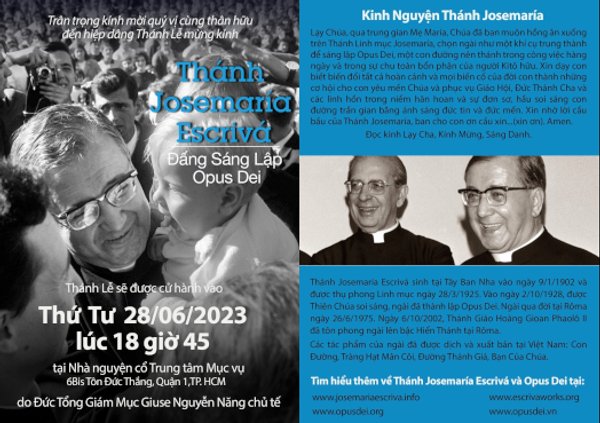 Thánh Lễ Mừng Kính Thánh Josemaria Escriva, Đấng Sáng Lập Opus Dei, sẽ được cử hành vào Thứ Tư 28/06/2023 lúc 18g45 tại Nhà nguyện Trung tâm Mục vụ, 6Bis Tôn Đức Thắng, Quận 1, TP. HCM, do Đức Tổng Giám Mục Giuse Nguyễn Năng chủ tế.