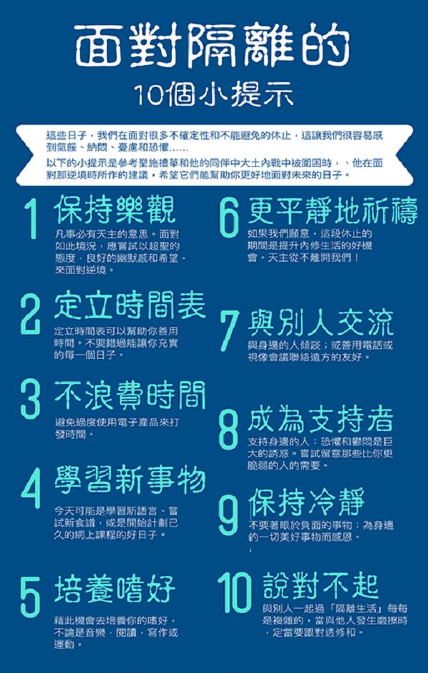 不過,這樣表面上無所作為的時間也是一個履行公民責任的機會。善用自己的時間,團結一致地為受影響最嚴重的人祈禱;請不要忘記醫護人員、政府官員,以及正在努力扭轉這種狀況的其他人士和機構。
