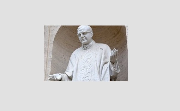 這尊雕像是雕塑大師羅瑪諾•高斯及的作品。他在他位於托斯卡尼區盧卡省比塔聖塔的工作室工作,比塔聖塔(Pietrasanta)這地方因米開朗基羅而著名。自2003年初至2005年5月,高斯及花了超過兩年的時間將速描圖像和粘土模型塑成大理石雕像。2005年9月初這尊雕像從比塔聖塔的工作室運抵羅馬,並用一架起重機安置在壁龕。
