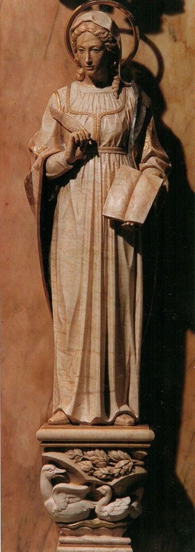 圣施礼华于1972年与圣十字架的罗马学院的学生进行家庭谈话时,被问及有关圣加大利纳的问题。他回答说:「我对她有非常的崇敬。你们知道她是我们其中的一位代祷圣者,在我奉献弥撒的祭台上,我放置了她的圣髑。我曾经写信给现任教宗[圣保禄六世],告诉他:我保留这圣髑是出于崇敬,因为她和我一样热爱教会和教宗。我不想说她爱得更多,因为这不是真的。我们都同样有着加大利纳的热爱。」他并且继续评论那铭文Dilexit opere et veritate……:「她以真爱和行动热爱教会和罗马教宗,就像你和我一样。」
