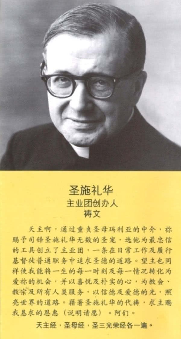 天主啊,通过童贞圣母玛利亚的中介,你赐予司铎圣施礼华无数的圣宠,选他为最忠信的工具创立了主业团,一条在日常工作及履行基督徒普通职务中追求圣德的道路。望主也同样使我能将一生的每一时刻及每一情况转化为爱你的机会,并以喜悦及樸实的心,为教会、教宗及所有人类服务,以信德及爱德的光,照亮世界的道路。藉著圣施礼华的代祷,求主赐我恳求的恩惠(说明请愿)。阿们。