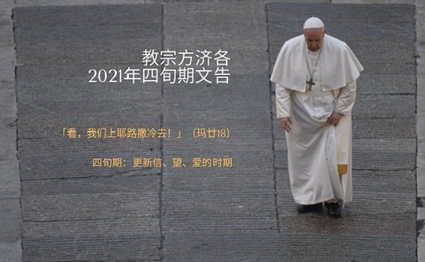 在走向复活节的四旬期之旅中,让我们记得「贬抑自己,听命至死,且死在十字架上」(斐二8)的那一位。在这段悔改的时期,让我们更新我们的信仰,从「活水」中汲取希望,以开放的心接受天主的爱,因祂使我们在基督内成为弟兄姊妹。在复活节前夕,我们会重宣领洗时的誓愿,并在天主圣神的工作中体验到重生,成为新人。四旬期之旅,就像基督徒一生的朝圣之旅一样,至今仍受到复活之光的照耀,而复活之光启发了基督门徒的思想、态度和决定。