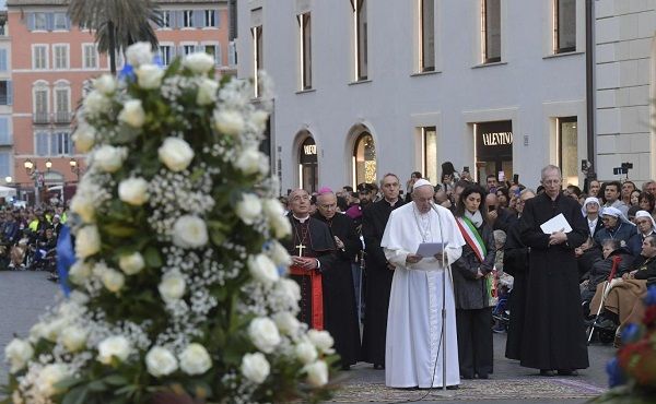教宗方濟各在聖母始胎無染原罪節前往羅馬西班牙廣場主持傳統的獻花活動,向聖母奉獻禱文,為羅馬居民、羅馬教區的神父、度奉獻生活的女性、執政者和遭遇困難的人祈禱。