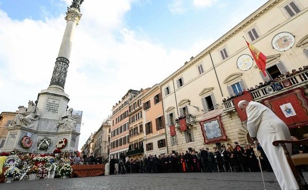 教宗方濟各按照慣例,今年12月8日聖母始胎無染原罪瞻禮也在西班牙廣場向聖母態像致敬,誦念一篇祈禱文。教宗感謝天主賜給我們一位「滿被聖寵」的母親,並指出心靈的腐敗是「最嚴重的危險」。