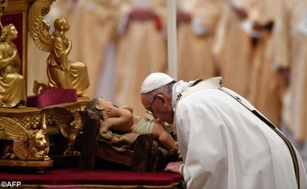 教宗方濟各2017年12月24日夜晚在梵蒂岡聖伯多祿大殿主持聖誕子夜隆重彌撒。彌撒開始前,全場參禮信眾在傳統的《聖誕宣報》歌詠中迎接耶穌聖嬰的降生。11位來自意大利、印度、非洲、波蘭、瑞士、中國、智利和秘魯的兒童為耶穌聖嬰獻花。教宗的講道從若瑟與瑪利亞在白冷城遭到的冷遇談起,指出這對年輕夫婦代表著許許多多被人拒絕的「外邦人、罪人、異鄉人」。教宗引用聖若望保祿二世的話,勉勵眾人「向基督敞開大門」,展開全新的社會想像空間,做希望的使者、天主殷勤好客的主人翁。