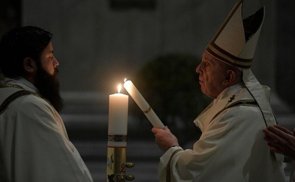 空蕩蕩的聖伯多祿大殿,寥寥無幾的參禮者,沒有聖洗聖事的復活前夕守夜禮:教宗方濟各今年4月11日在這個罕見至極的背景下,帶領天主子民紀念耶穌基督死而復活的奧跡。由於新冠病毒的全球大流行,世界許多國家限制了群聚活動,教會暫停公開禮儀,以防疫情擴散。看著感染和死亡人數節節攀升,世人有如處於漫漫長夜,不知道什麼時候才能走出「墳墓」。守夜禮的復活宣報詞再次迴盪於耳邊,提振基督徒的信望愛三德。教宗在講道中讚賞許多人此時此刻的愛德見證,堅定眾人對復活主耶穌的信德,重燃有關新生命的望德。