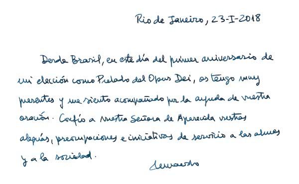 現在我人在巴西,在被遴選為主業團監督的第一個週年,我將你們每一個人,深深地牢記於心,也因為透過你們祈禱的幫助,我深感陪伴。我把你們的喜樂、擔憂,以及為服務人靈與社會所辦的一切活動,全託付于阿帕雷西達聖母(Our Lady of Aparecida)。